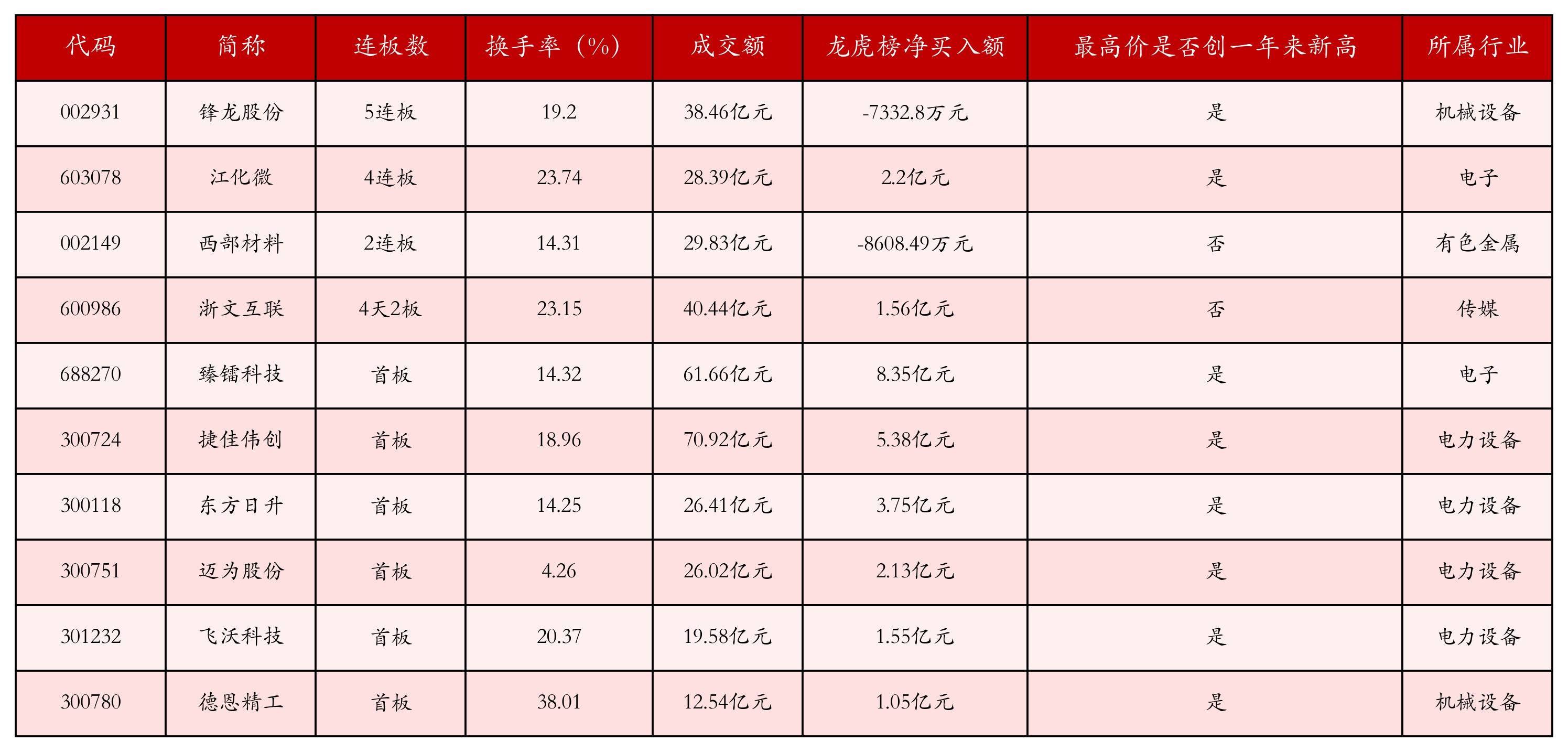 截至1月23日收盘,上证综指上涨0.33%,收于4136.16点,深证成指上涨0.79%,收于14439.66点,创业板指上涨0.63%,收于3349.5点。今日沪深两市A股共计120只涨停,综合当前连板数以及当日龙虎榜数据如何配资,其中较为强势的前三只个股分别为:锋龙股份(002931)、江化微(603078)与西部材料(002149)。今日强势个股前10位具体数据见下表: