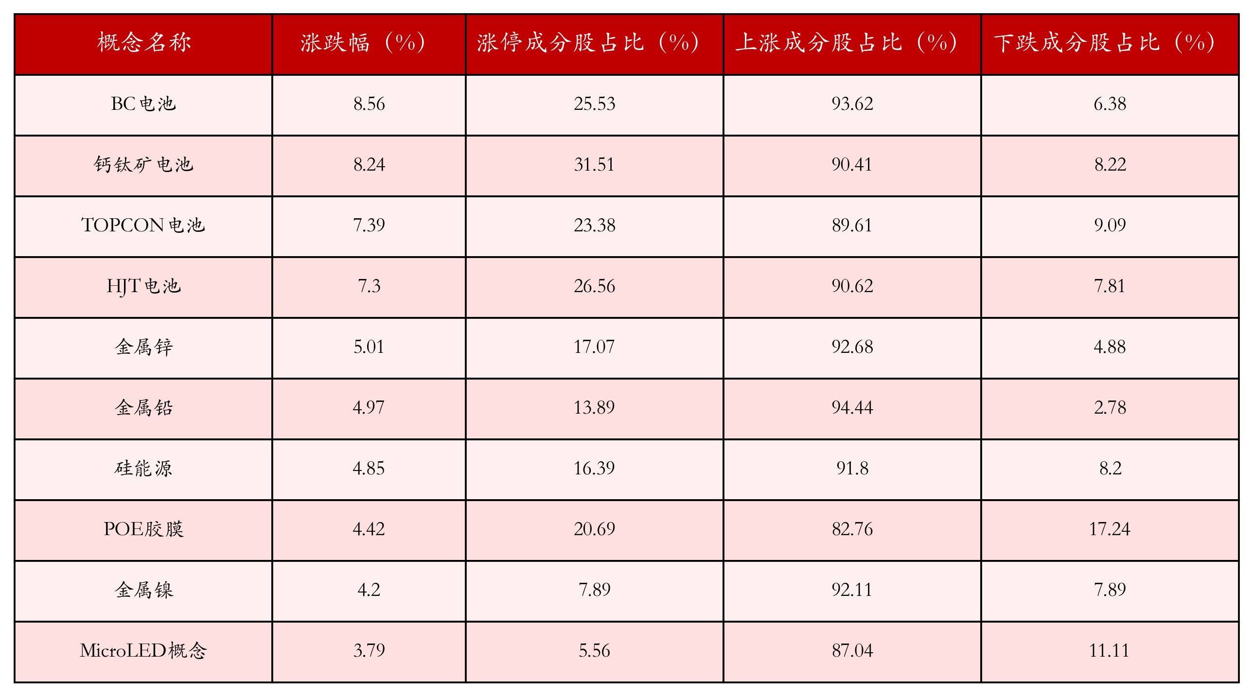 根据A股概念涨跌幅与所对应的股票池综合分析,涨幅靠前的三个概念板块分别为:BC电池、钙钛矿电池与TOPCON电池。排名前10位的概念板块相关数据见下表: